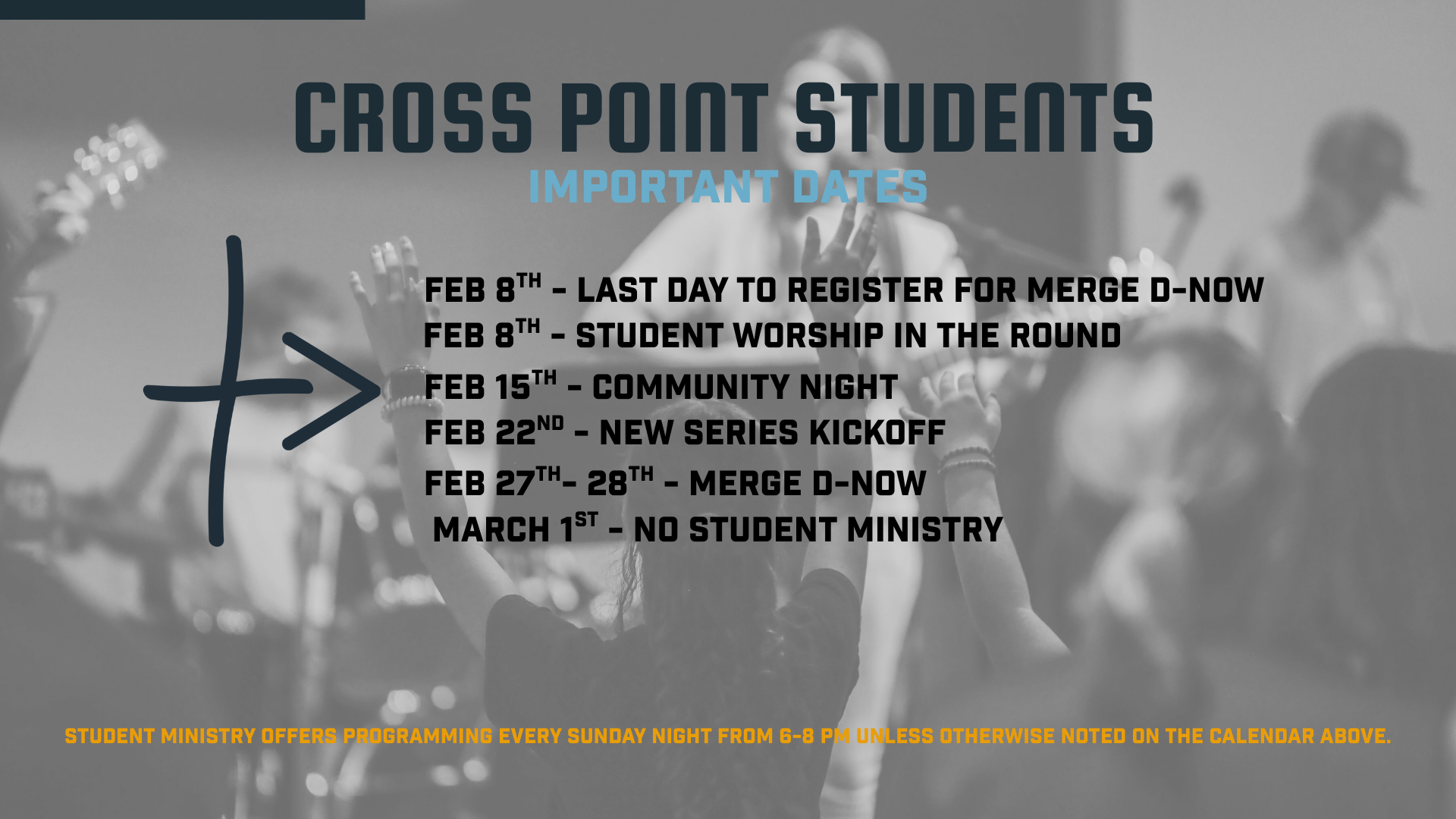 Middle and high school can be complicated, but at Cross Point Student Ministry, students don’t have to navigate it alone. We’re all about helping students find and follow Jesus in the context of a Gospel-driven community. We champion the Church and the family as we walk alongside students and parents through the highs and lows of life. On Sunday nights, students experience worship that points to Jesus, teaching that challenges them to think and live for Him, and small groups where they can be real with friends and adult leaders who are there every week to invest in their lives. Our hope is that every student would come to discover that Jesus is greater than any other option they could ever choose for their life.